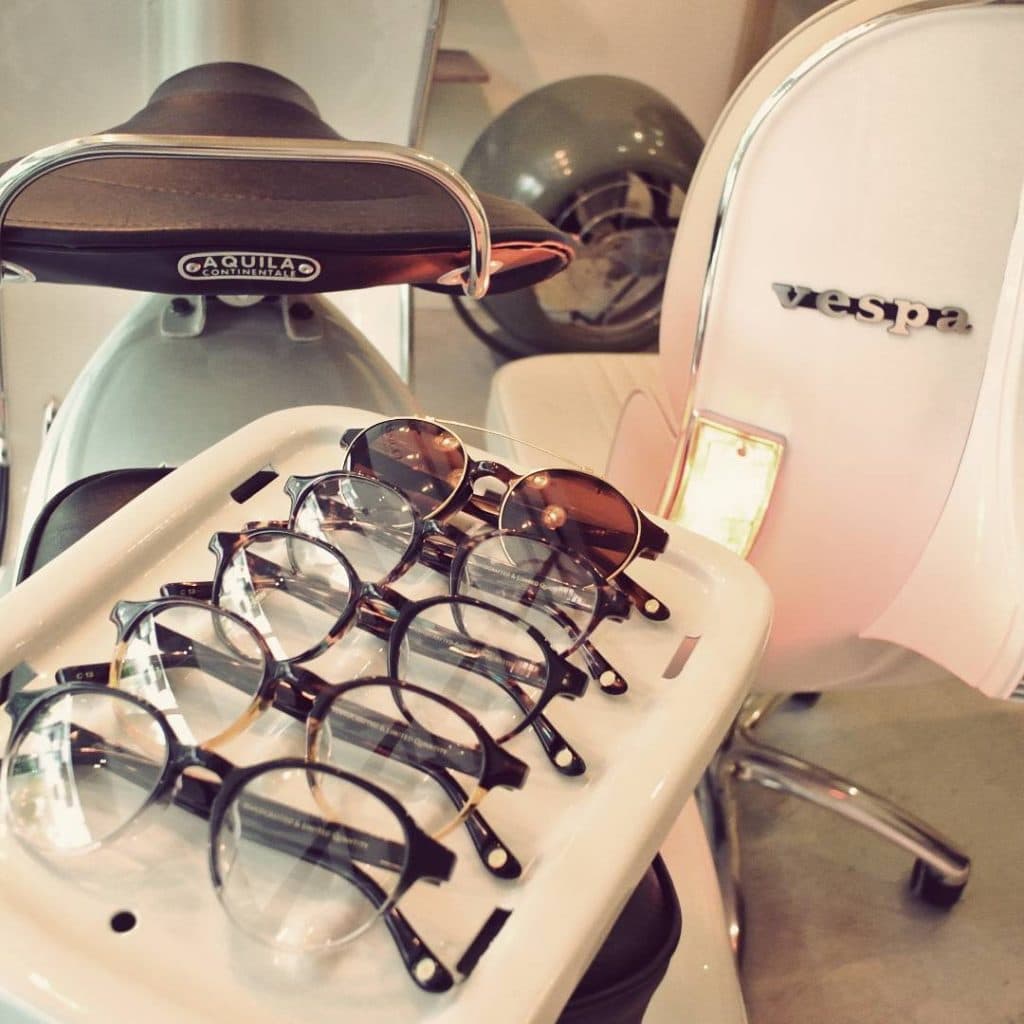 Among the crazy hustle and bustle, the endless modernist storefronts and mass-produced products, we find the hidden gem that is CLASSICO. This small eyewear shop, with a Vespa scooter parked always in front, has a minimalist and detailed style. It is a breath of fresh air that makes time stop as soon as you walk in. With its clean and minimalist lines, this small shop features some of the most sophisticated self-made eyewear with a vintage and retro style. The shop is full of surprises, like its owners Gary and Tom. Among the exclusive decoration, which they cherish, we can find two beautifully customized Scooter Chairs.