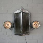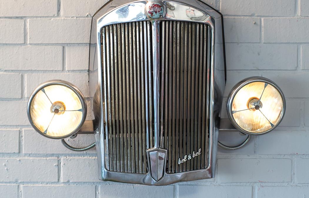 Our exclusive ‘Triumph Lamp’, made by order with the front grill and headlights of a 1940’s vehicle, evoques strength and character. It doesn’t forget about its past but looks to the future. It possesses the beauty and elegance of classic vehicles and hints a modern and unsuspected touch to the space around it.